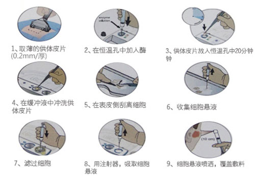 3、采用 领先的融合细胞“上喷”技术,1*1平方厘米供体皮片获得的上皮细胞悬液可覆盖80平方厘米创面。供体皮肤组织仅需要提供2cm*2cm,可实现大面积320平方厘米的白癜风治疗;