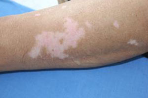 2、手臂白癜风初期症状病变呈纯白色圆形或不规则的脱失斑,表面光滑,边界清楚,边缘色素增多。变白的皮肤对日光较正常皮肤敏感,稍晒太阳即发红。病程经过缓慢,渐向四面扩大,互相融合或达到一定程度时停滞蔓延,历久不变。发病时间短、面积小,如能得到早期治疗,疗效较好,故早期治疗至关重要。